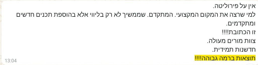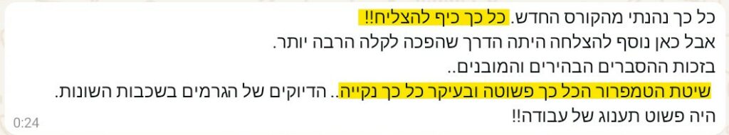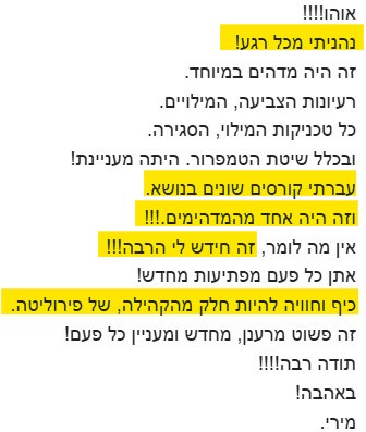 חויתי למידה מקצועית, נגישה ונעימה כל כך! אני רואה תוצאות מדהימות ומלאת סיפוק:)