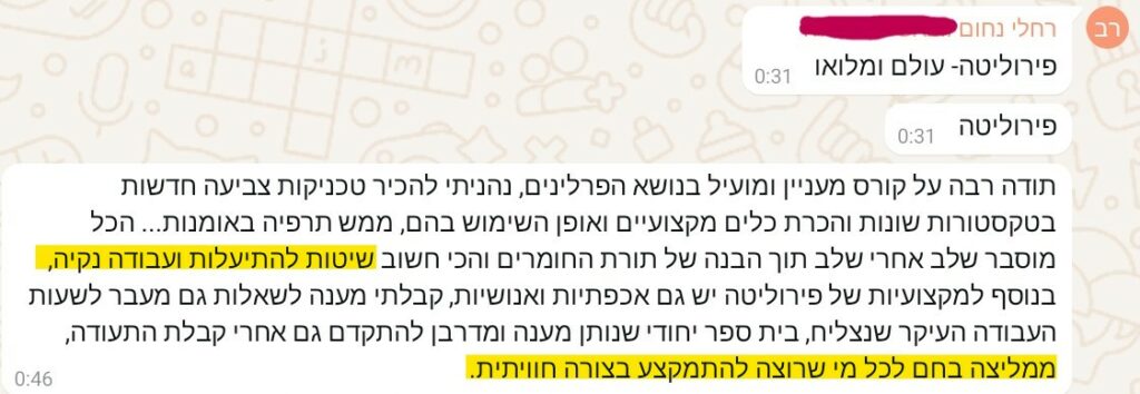 צפיתי עם בעלי בשיעורים הראשונים ודי מהר היה ברור לשנינו שלמרות ההוצאה של הקורס הקודם- (בבית ספר אחר) אם אני באמת רוצה להתמקצע זה המקום בשבילי- פירוליטה!