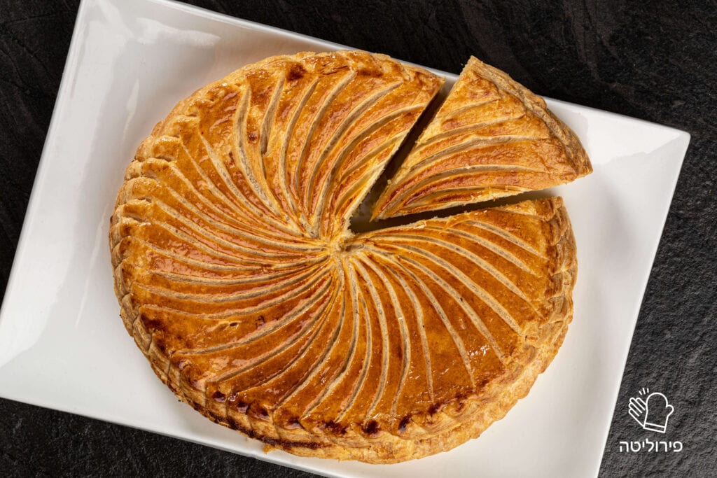 מזלפים לתוך עיגול בצק העלים קרם שקדים (בספירלה)