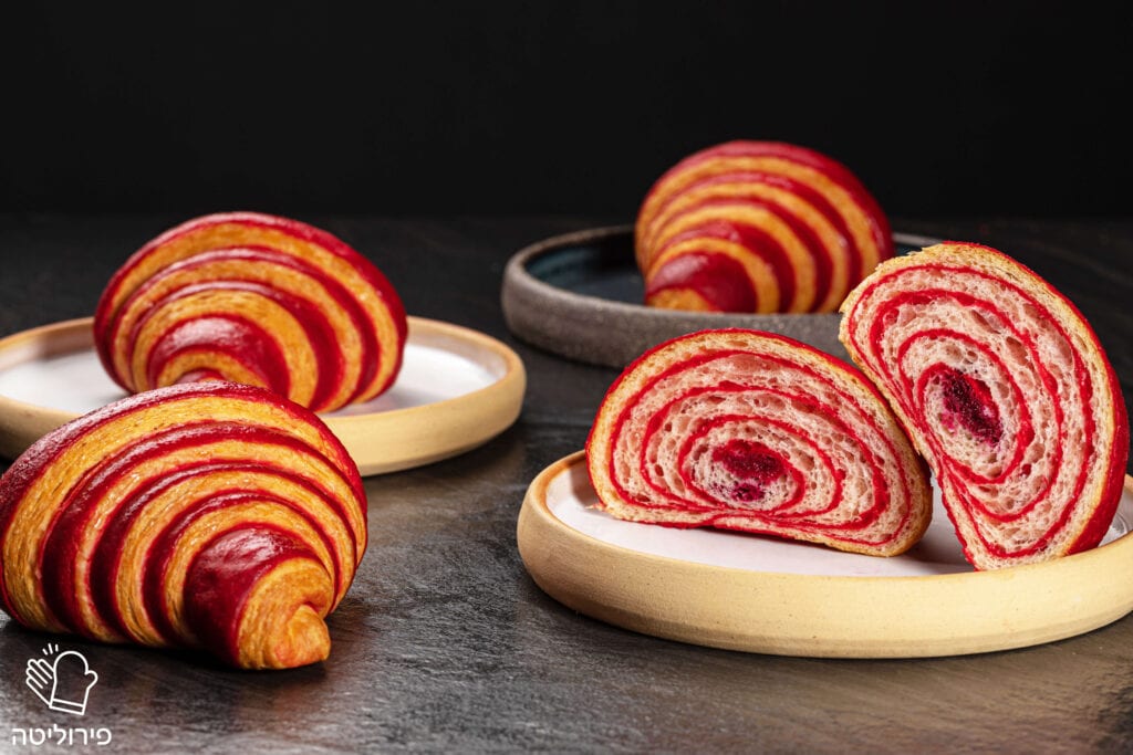 נותנים לקונפי להתקרר עד שהוא יתייצב ומשתמשים בו כדי למלא את הקרואסון האדום אחרי האפייה.