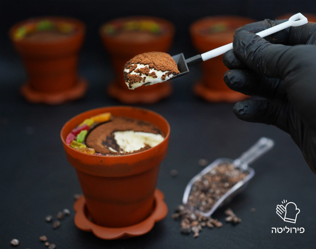מטביעים במוס, מזלפים עוד מעט מוס ומסננים מעל אבקת קקאו,